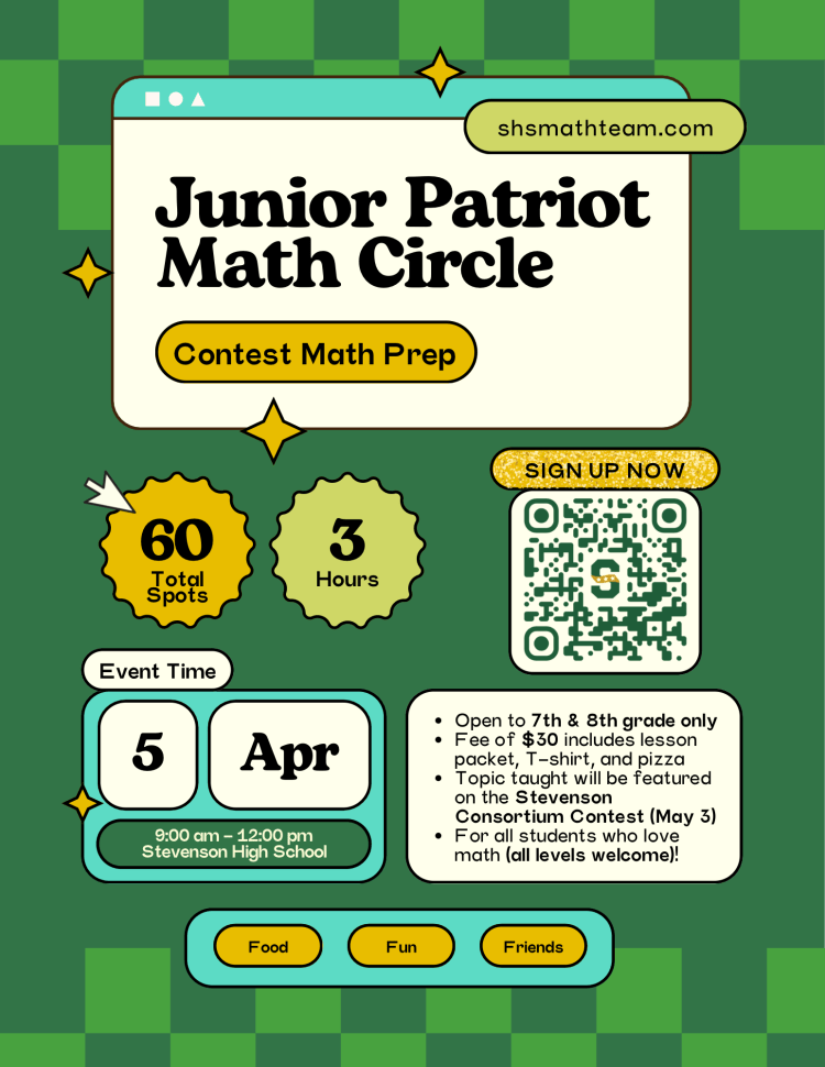 The 2025 Junior Patriot Math Circle will be held on April 5, 2025 from 9:00 am – 12:00 pm at Stevenson High School. The topic(s) taught will be featured on the Stevenson Consortium Contest (see here).