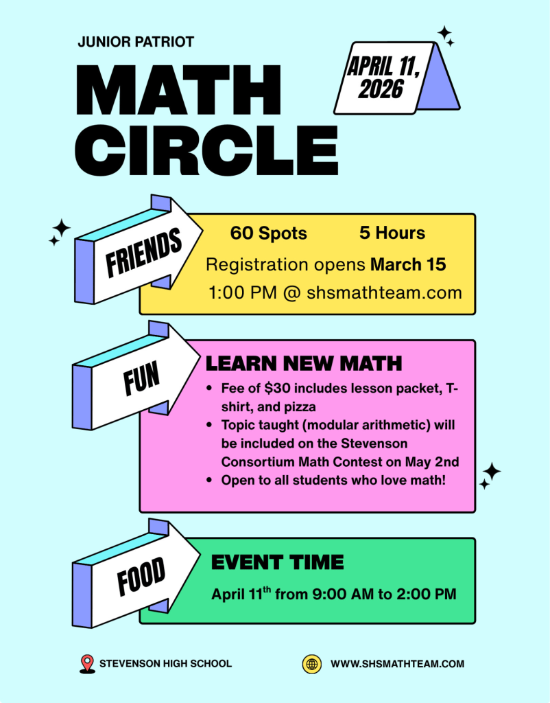 The 2026 Junior Patriot Math Circle will be held on April 11, 2026 from 9:00 am – 2:00 pm at Stevenson High School. The topic(s) taught will be featured on the Stevenson Consortium Contest (see here).