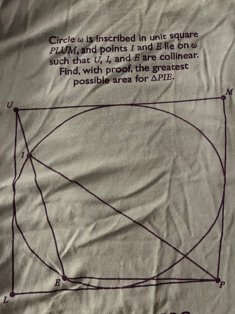 solve a cool problem and explore a new idea every week! A new problem and the solution to last week’s problem will be posted here every week. Currently, the Problem of the Week is on hold. In the meantime, PoTW #31 has an indefinite submission period: solve these three problems featured on math t-shirts!